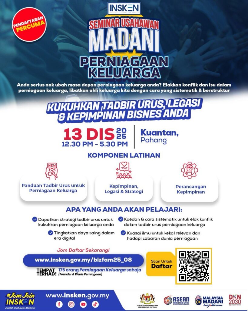 Dalam Seminar Usahawan MADANI: Perniagaan Keluarga, anda akan bongkar strategi sebenar yang digunakan oleh founder & pewaris yang berjaya menyambung, memperkukuh dan melompatkan bisnes keluarga mereka.